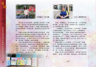 的學校,因此和它有著深深的情感及濃濃的回憶。 限思緒,自己和「頂埔」的淵源之深,回想起來, 斯苑等老師的全力支持,讓我在工作場合上有所發 在頂埔國小服務了將近 30 年。