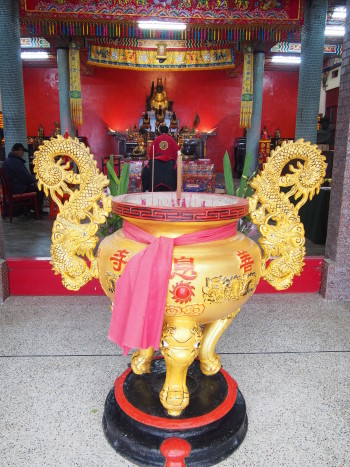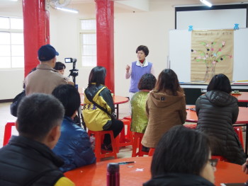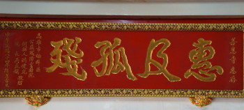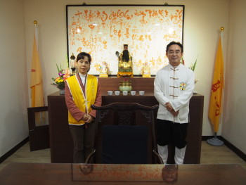 Religion: The last one is religion. We believe that religion can stabilize people and Shanxi temple is a dual practice place for Buddhism and Daoism. We used to arrange Buddhism and Daoism together in the past but now the Buddhist statuses are stored on the fourth floor while a meditation area is set up. The status of Lu Dong Bin is on the fifth floor. Some people regard Daoism as deceiving but actually Daoism also persuades people to do good and it is good. Buddhism comes with many religious doctrines while Daoism also offers doctrines. For example, the 100-word inscription behind me is the caring approach passed down by Lu Dong Bin. We hope to turn around everyone's idea and some of the wonderful things in Daoism could be used and sometimes you really could not explain them. Once when I was little, a police officer came to investigate on a crime case that could not be resolved. He knelt down to ask the Lu Dong Bin and Lu gave answer through my mother's mouth: "An old ox growing mustache (Taiwanese)." The police official thought about it later and said that the surname of the suspect was "Zhu." Sometimes people were cured for unknown fever at the pavilion by Shanxi Temple and I have seen it with my eyes and I am sure that it was not a fraud.