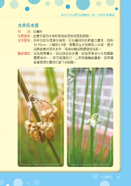 新北市土城區頂埔國民小學/頂埔花草饗宴 大井氏水莞 科 別:莎草科 生長環境:台灣全島的水田和低海拔溼地常見到蹤跡。 生長習性:多年生挺水或濕生植物,近似圓柱狀的稈直立叢生,高約 15-70cm,小穗約2-8個,聚集側生在莖稈的上半部,種子 成熟後會掉落在水中,等待時機成熟便發芽成長。 觀察重點:因為莖稈叢生,因此許多如水蠆、紅娘華等水中生物喜歡 藏匿其中,一來可保護自己,二來伺機捕食獵物,莖稈偶 而會發現水蠆羽化留下的蛻殼。 水生植物 109