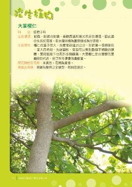 陸 生植 物 大葉欖仁 科 別:使君子科 生長環境:耐風、耐濕也耐鹽,喜歡高溫和陽光充足的環境,因此適 合生長於海濱。在台灣常植為園景樹或為行道樹。 生長習性:欖仁的葉子很大,長度常超過25公分,形狀像一個倒卵形 ,葉大而柄短,先端圓形,葉面可以見到數個不明顯的腺 體,葉背脈腋下也有許多個腺窩。大葉欖仁是台灣變色葉 植物的代表,到了秋冬便會落盡樹葉。 開花顏色及花期:米黃色。花期為夏季。 葉脈及葉緣:葉緣為整齊之全緣型,稍具波浪狀。 14 www.dpes.ntpc.edu.tw