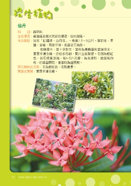 陸 生植 物 仙丹 科 別:茜草科 生長環境:喜溫暖及陽光充足的環境,但也耐蔭。 生長習性:別名「紅繡球、山丹花」。株高1.5~3公尺。葉對生、革 質、全緣、兩面平滑,拖葉呈三角形。 常綠灌木,葉十字對生,葉形為長橢圓形葉端突尖, 葉面平滑全緣,分枝多而細,葉片生長緊密。花則為橙紅 色,長在枝葉頂端,有4-5片花瓣,為長卵形,雄蕊有四 枚,四季皆開花,夏季則為盛開期。 開花顏色及花期:花為橙紅色,花期夏季。 葉脈及葉緣:葉面平滑全緣。 28 www.dpes.ntpc.edu.tw