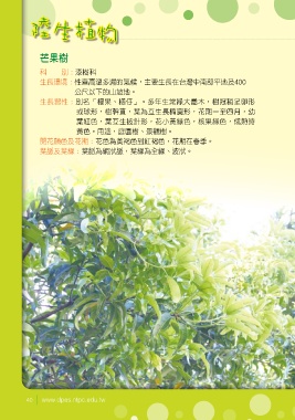 陸 生植 物 芒果樹 科 別:漆樹科 生長環境:性喜高溫多濕的氣候,主要生長在台灣中南部平地及400 公尺以下的山坡地。 生長習性:別名「檬果、檨仔」。多年生常綠大喬木,樹冠稍呈卵形 或球形,樹幹直,葉為互生長橢圓形,花期一至四月,幼 葉紅色,葉互生披針形,花小黃綠色,核果綠色,成熟時 黃色。用途,庭園樹、景觀樹。 開花顏色及花期:花色為黃褐色到紅褐色,花期在春季。 葉脈及葉緣:葉脈為網狀脈,葉緣為全緣、波狀。 40 www.dpes.ntpc.edu.tw