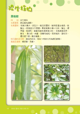 陸 生植 物 黑板樹 科 別:夾竹桃科 生長環境:春至夏為適期。 生長習性:常綠大喬木,具乳汁。樹冠傘蓋狀,樹幹挺直灰褐色,枝 輪生。枝條呈水平展開。掌狀複葉小葉4-10枚,輪生,硬 革質,倒卵形,葉面深綠色葉背淺白色。 花為聚織花序, 複生 ,黃白色,肉質,冠喉有絨毛。萊果褐色,圓柱形, 叢生而下垂。種子細長。 開花顏色及花期:綠白色的花,每年11月到12月為開花時期。 葉脈及葉緣:網狀脈、全緣。 68 www.dpes.ntpc.edu.tw