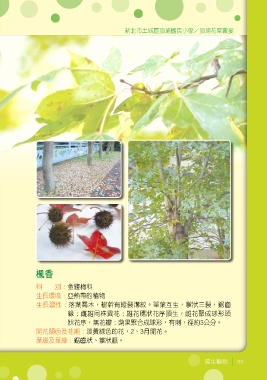 新北市土城區頂埔國民小學/頂埔花草饗宴 楓香 科 別:金縷梅科 生長環境:亞熱帶的植物 生長習性:落葉喬木,樹幹有縱裂溝紋。單葉互生,掌狀三裂,鋸齒 緣;雌雄同株異花;雄花穗狀花序頂生,雌花聚成球形頭 狀花序,無花瓣;蒴果聚合成球形,有刺,徑約3公分。 開花顏色及花期:淡黃綠色的花,2、3月開花。 葉脈及葉緣:鋸齒狀、掌狀脈。 陸生植物 69