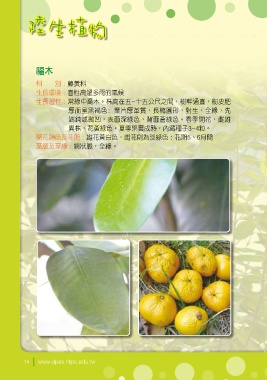 陸 生植 物 福木 科 別:藤黃科 生長環境:喜性高溫多雨的氣候 生長習性:常綠中喬木。株高在五~十五公尺之間,樹幹通直,樹皮肥 厚而呈黑褐色﹔葉片厚革質,長橢圓形,對生,全緣,先 端鈍或微凹,表面深綠色,背面蒼綠色。春季開花,雌雄 異株,花黃綠色。夏季果實成熟,內藏種子3~4粒。 開花顏色及花期:雄花黃白色,雌花則為淡綠色;花期5、6月間 葉脈及葉緣:網狀脈,全緣。 74 www.dpes.ntpc.edu.tw