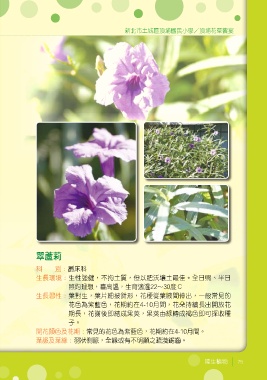 新北市土城區頂埔國民小學/頂埔花草饗宴 翠蘆莉 科 別:爵床科 生長環境:生性強健,不拘土質,但以肥沃壤土最佳。全日照、半日 照均理想,喜高溫,生育適溫22~30度C 生長習性:葉對生,葉片細披針形,花梗從葉腋間伸出,一般常見的 花色為紫藍色,花期約在4-10月間,花朵持續長出開放花 期長,花謝後即結成果莢,果莢由綠轉成褐色即可採收種 子。 開花顏色及花期:常見的花色為紫藍色,花期約在4-10月間。 葉脈及葉緣:羽狀側脈,全緣或有不明顯之疏淺鋸齒。 陸生植物 75