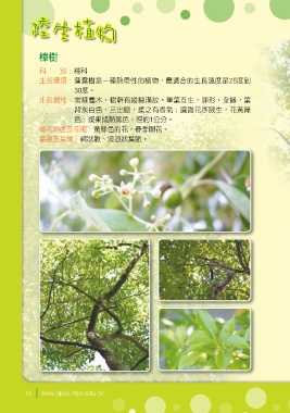 陸 生植 物 樟樹 科 別:樟科 生長環境:蓮霧樹是一種熱帶性的植物,最適合的生長溫度是25度到 30度。 生長習性:常綠喬木,樹幹有縱裂溝紋。單葉互生,卵形,全緣,葉 背灰白色,三出脈,揉之有香氣;圓錐花序腋生,花黃綠 色;漿果成熟黑色,徑約1公分。 開花顏色及花期:黃綠色的花,春季開花。 葉脈及葉緣:網狀脈、波浪狀葉脈。 82 www.dpes.ntpc.edu.tw