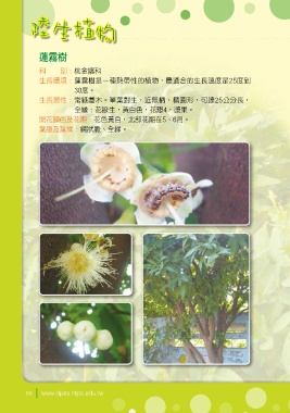 陸 生植 物 蓮霧樹 科 別:桃金孃科 生長環境:蓮霧樹是一種熱帶性的植物,最適合的生長溫度是25度到 30度。 生長習性:常綠喬木。單葉對生,近無柄,橢圓形,可達25公分長, 全緣;花腋生,黃白色,花瓣4,漿果。 開花顏色及花期:花色黃白,北部花期在5、6月。 葉脈及葉緣:網狀脈、全緣。 84 www.dpes.ntpc.edu.tw