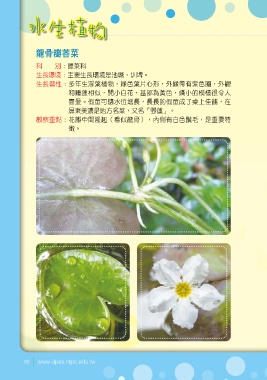 水 生植 物 龍骨瓣莕菜 科 別:睡菜科 生長環境:主要生長環境是池塘、圳埤。 生長習性:多年生浮葉植物,綠色葉片心形,外緣帶有紫色圈,外觀 和睡蓮相似,開小白花,基部為黃色,嬌小的模樣很令人 喜愛。假莖可隨水位增長,長長的假莖成了桌上佳餚,在 屏東美濃是地方名菜,又名「野蓮」。 觀察重點:花瓣中間隆起(看似龍骨),內側有白色鬚毛,是重要特 徵。 90 www.dpes.ntpc.edu.tw