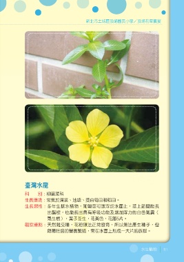 新北市土城區頂埔國民小學/頂埔花草饗宴 臺灣水龍 科 別:柳葉菜科 生長環境:常見於溝渠、池塘、茭白筍田和稻田。 生長習性:多年生挺水植物,匍匐莖可漂浮於水面上,莖上節間能長 出鬚根,也能長出具有呼吸功能及增加浮力的白色氣囊( 氣生根),葉子互生,花黃色,花瓣5片。 觀察重點:天然雜交種,花粉無法正常發育,所以無法產生種子,但 藉著旺盛的營養繁殖,常在水面上形成一大片的族群。 水生植物 91
