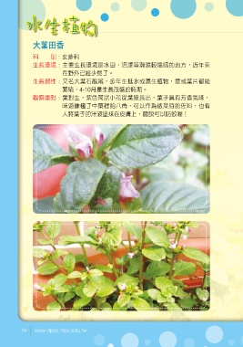 水 生植 物 大葉田香 科 別:玄參科 生長環境:主要生長環境是水田、沼澤等潮濕較陰暗的地方,近年來 在野外已經少見了。 生長習性:又名大葉石龍尾,多年生挺水或濕生植物,莖或葉片都能 繁殖,4-10月是生長茂盛的時期。 觀察重點:葉對生,紫色筒狀小花從葉腋長出,葉子具有芳香氣味, 味道像極了中藥裡的八角,可以作為做菜時的佐料,也有 人將葉子的汁液塗抹在皮膚上,聽說可以防蚊喔! 94 www.dpes.ntpc.edu.tw