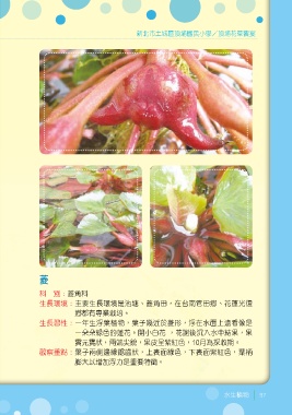 新北市土城區頂埔國民小學/頂埔花草饗宴 菱 科 別:菱角科 生長環境:主要生長環境是池塘、菱角田,在台南官田鄉、花蓮光復 鄉都有專業栽培。 生長習性:一年生浮葉植物,葉子幾近於菱形,浮在水面上遠看像是 一朵朵綠色的蓮花。開小白花 ,花謝後沉入水中結果,果 實元寶狀,兩端尖銳,果皮呈紫紅色,10月為採收期。 觀察重點:葉子兩側邊緣鋸齒狀,上表面綠色,下表面紫紅色,葉柄 膨大以增加浮力是重要特徵。 水生植物 97