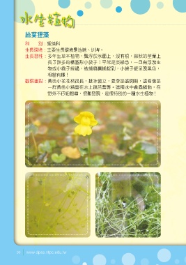 水 生植 物 絲葉狸藻 科 別:狸藻科 生長環境:主要生長環境是池塘、圳埤。 生長習性:多年生草本植物,飄浮於水面上,沒有根,絲狀的莖葉上 長了許多的橢圓形小袋子!平常是淡綠色,一旦有浮游生 物或小蟲子經過,被捕蟲囊捕捉到,小袋子便呈現黑色, 相當有趣! 觀察重點:黃色小花花柄很長,挺水傲立,夏季是盛開期,遠看像是 一群黃色小精靈在水上跳芭蕾舞。這種水中食蟲植物,在 野外不仔細搜尋,很難發現,是很特別的一種水生植物! 98 www.dpes.ntpc.edu.tw