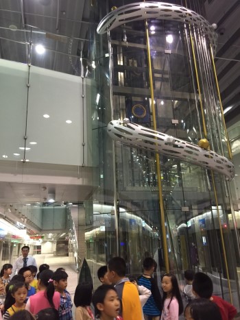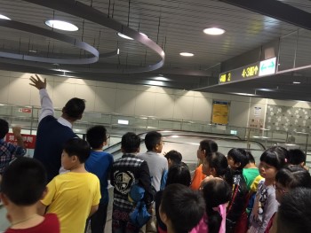 接著,站長和我們介紹一個特別的公共藝術品「飛旋-夢的起點」,哇!這個作品好像蛇啊!但是站長說:「這東西不是蛇,是龍喔!」那隻金銀色的龍纏繞在電梯上,好像在保護電梯的乘客!